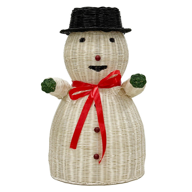 The Rattan Snowman Decoration from the Peppermint Sticks Collection features a charming snowman crafted from light-colored woven rattan, complete with a black hat, orange nose, dark eyes, and a cheerful red ribbon scarf. Accented with green hands, this versatile holiday piece serves as both a festive decoration and a functional holder for small items, adding a cozy, handcrafted touch to your seasonal décor. Measures: 12 x 21 Inches.