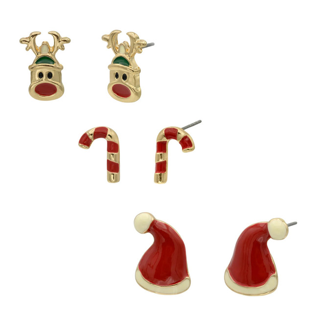 Add festive sparkle to your holiday look with this 3-pack of Christmas stud earrings. Featuring assorted designs and vibrant seasonal colors, each pair brings cheerful charm to any outfit. Perfect for gifting or adding a playful touch to your own winter wardrobe.