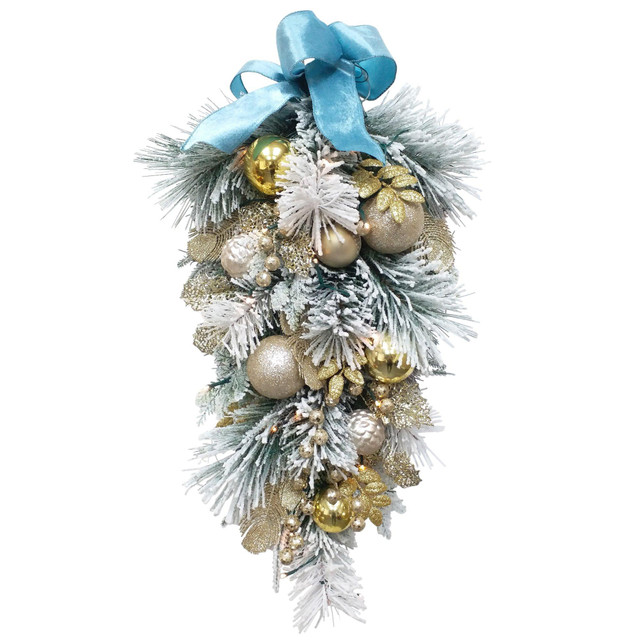 Bring winter charm to your décor with this 30-inch teardrop Christmas wreath. Featuring a frosted finish for a snowy effect, it blends festive greenery with seasonal elegance.