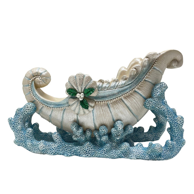 Make waves this holiday season with the 8-Inch Blue Sleigh from Jewels of the Sea collection. This elegant decorative piece features a shimmering pearlescent seashell sleigh, intricately detailed with ridges and a graceful curve reminiscent of ocean treasures. A festive touch is added with a ruffled shell at the front, adorned with green holly leaves and red berries,blending holiday magic with coastal charmperfect for beach-inspired Christmas décor. Measures: 14 x 7 x 8 Inches.