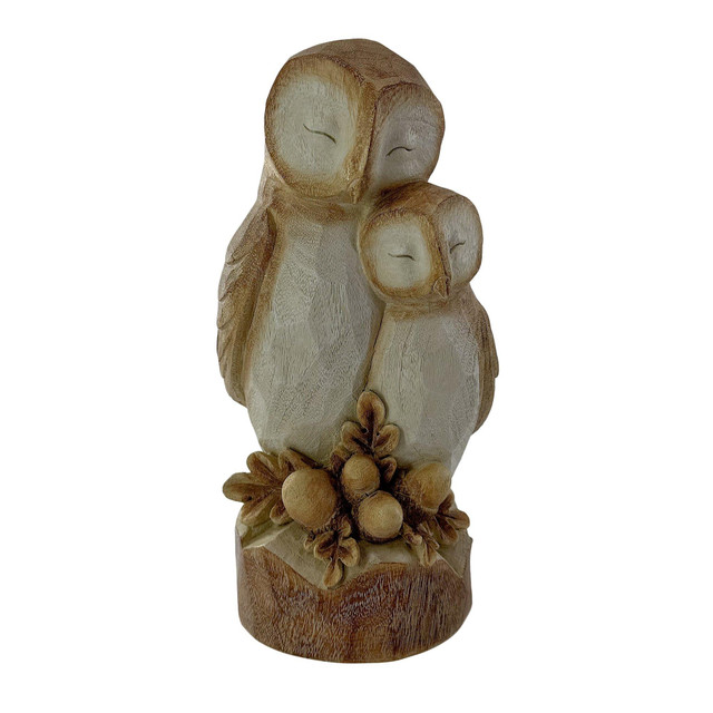 This charming figurine features a cuddling owl couple with eyes gently closed, perched on a tree stump-inspired base adorned with acorn details. Designed with a woodgrain texture and vintage appeal, it evokes warmth and serenity. Often crafted from porcelain or ceramic, this nostalgic piece recalls classic Gorham music boxes and makes a heartwarming accent for fall or year-round décor. Measures: 5in. x 4.25in. x 9.75in.