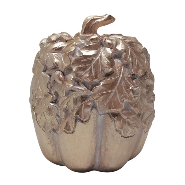 Elevate your fall décor with this elegant metallic-finished pumpkin,eaturing intricate leaf detailing and a stem-like handle. Handcrafted from polyresin and calcium carbonate, its perfect as a fall decorative accent. Measures: 7.9in. x 7.6in. x 9in.