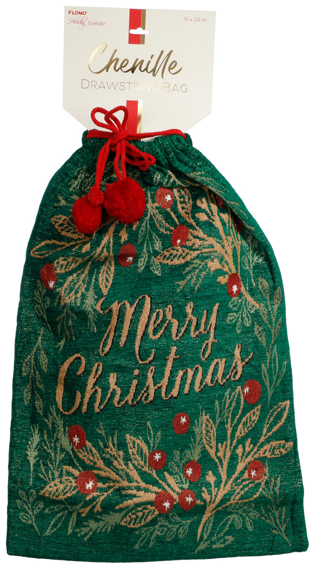A festive, reusable gift bag made from soft chenille fabric in green with red berries and Merry Christmas embroidered in gold. Features a convenient red drawstring with pom-poms for easy closurean eco-friendly alternative to traditional wrapping. Perfect for holiday gift giving. Measures approximately 19 in x 29 in.