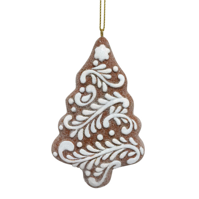 Add a sweet, festive touch to your holiday décor with the Poly Gingerbread Tree Ornament from the Peppermint Sticks Collection. This charming ornament is shaped like a gingerbread tree, featuring rich brown tones reminiscent of baked cookies, decorated with intricate white icing details and a touch of glitter for a frosted, sparkling effect. Perfect for adding a whimsical and deliciously festive accent to your Christmas tree.Measures: 3 x 1 x 4.25 Inches.