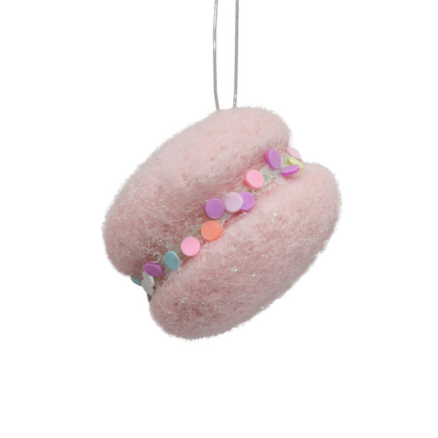 From the Sugar Plums Collection, this light pink plush macaron features colorful sequin accents along the filling and a white hanging loop. A sweet and whimsical addition to your holiday decor. Measures:2.5 x 2.5 x 2.5 Inches.