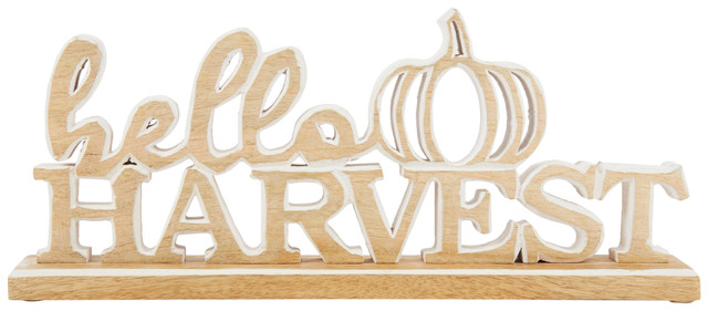 Welcome the season with this wooden Hello Harvest sign. Featuring warm tones and rustic charm, it is a cozy accent for entryways, porches, or kitchen walls. Perfect for celebrating falls arrival. Measures 14.5 in x 2.5 in x 7 in
