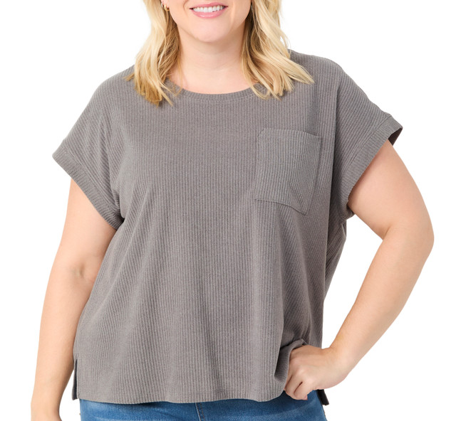 This plus size short sleeve crew neck top features soft ribbed fabric, a chest pocket, and a solid color design. Athleisure style combines comfort and versatility, making it perfect for casual outings, everyday wear, and relaxed active days. Top measures approximately 25.5 in long. Fabrication is 89% polyester and 11% spandex.