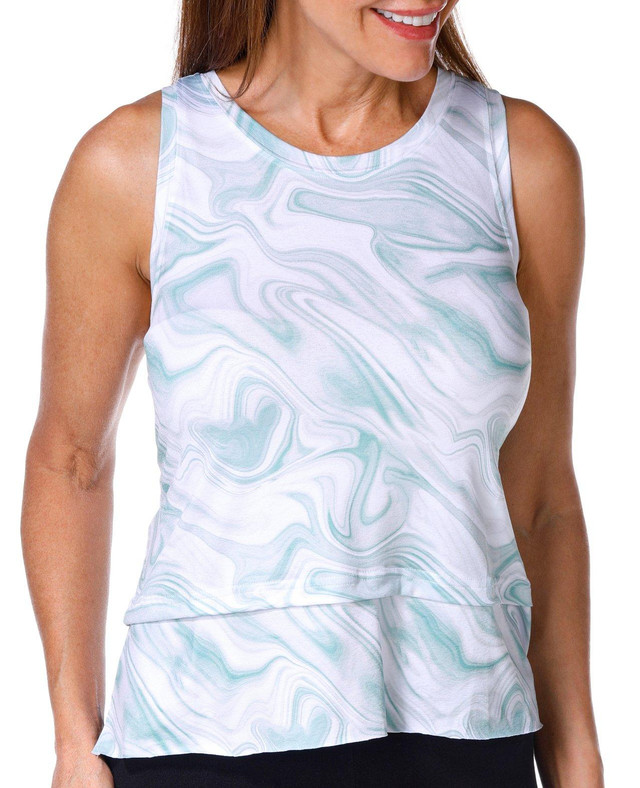 Stay cool and confident in this womens active marble print tank top. Designed with a classic crew neckline and performance stretch fabric, it moves with you through every workout or casual day out. The marble pattern adds a modern touch to your athletic wardrobe. Fabrication 93% polyester, 7% spandex