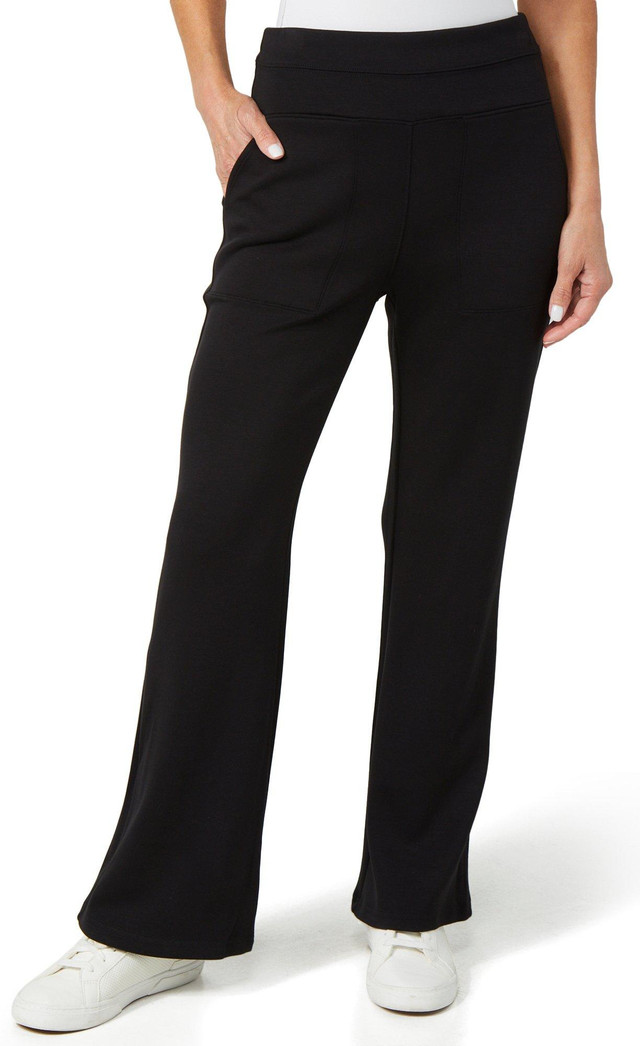 These women's active scuba flare leggings combine sleek style with functional comfort. Made from smooth scuba fabric, they feature side seam pockets for on-the-go essentials and a flattering flare leg for a modern twist. Perfect for workouts or casual wear with a sporty edge. Fabrication is 52% recycled polyester, 41% viscose, and 7% spandex.