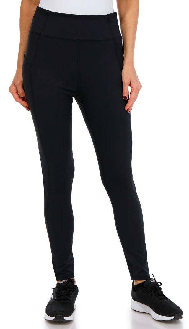 Stay comfortable and stylish in the Womens Twist Ankle Leggings, featuring soft, lightweight stretch fabric with a chic solid color design. The high rise fit, ankle length and twist detail at the hem create a flattering, modern look, while two side pockets keep essentials close. Moisture wicking technology helps keep you cool and dry during workouts or casual wear. Inseam measures approximately 26 in. Fabrication is 80% polyester, 20% spandex.
