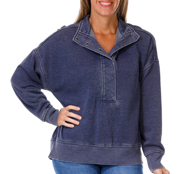 The womens Long Sleeve Button Popover Top blends comfort and everyday style. Soft fabric and an easy popover design create a relaxed look that works from morning errands to casual evenings. Subtle button details add charm while the flattering fit makes this top an effortless wardrobe staple. Fabrication is 48% polyester, 52% cotton. Length measures approximately 26 in.