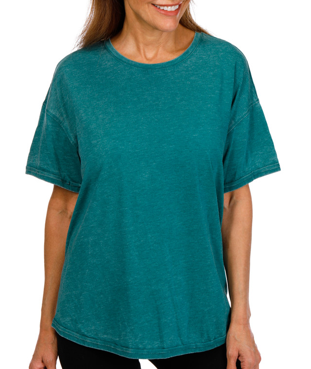 Elevate your casual wardrobe with this Acid Wash Tee. It features a flattering scoop neckline and a stylish raw edge hem that adds a modern touch. Made from soft, breathable fabric, it's perfect for warm-weather days or layering with your favorite pieces. Fabrication is 52% Cotton, 48% Polyester.