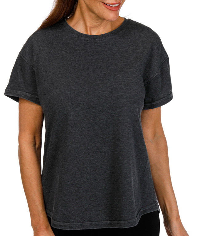 Elevate your casual wardrobe with this Acid Wash Tee. It features a flattering scoop neckline and a stylish raw edge hem that adds a modern touch. Made from soft, breathable fabric, it's perfect for warm-weather days or layering with your favorite pieces. Fabrication is 52% Cotton, 48% Polyester.