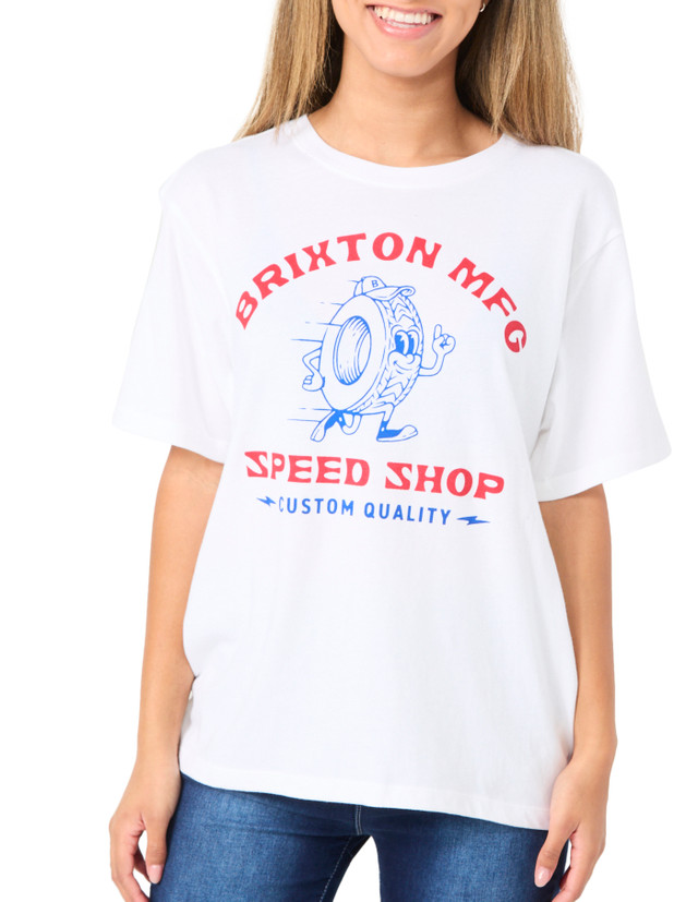This juniors tee features a vintage inspired tire shop graphic with a classic crew neckline and short sleeves. Its soft feel and laid back look make it an easy pick for everyday style with a retro edge. Top length measures approximately 25 inches. Fabrication 100% cotton