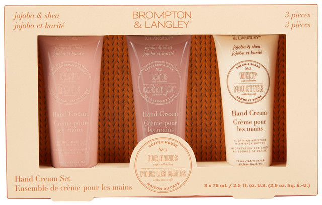 Indulge in comforting care with the 3 piece Coffee House hand cream set featuring Roasted Pecan and Honey, Espresso and Milk, and Cream and Sugar scents. Each 2.5 oz tube is enriched with jojoba and shea butter to deliver soothing moisture and lasting hydration. Ideal for gifting or daily self care. Contains 3 x 2.5 oz.