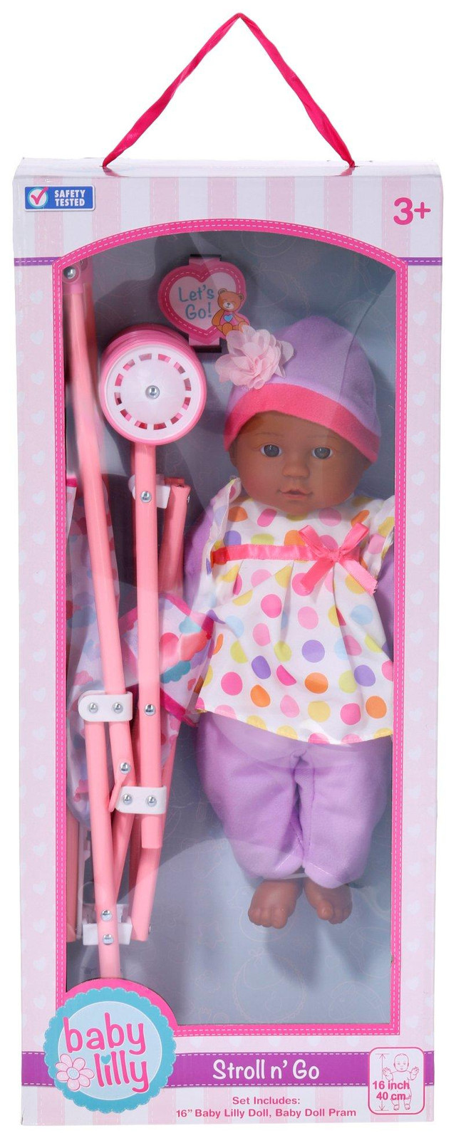 Encourage nurturing play with the 2 Piece Baby Lilly Doll and Stroller Set featuring a 16 inch baby doll dressed in a polka dot top, purple pants, and a pink hat with flower detail. Doll includes bright fixed open brown eyes and realistic features. Pink stroller for on the go fun. Designed to inspire imagination and empathy. Recommended for ages 3 years and up.