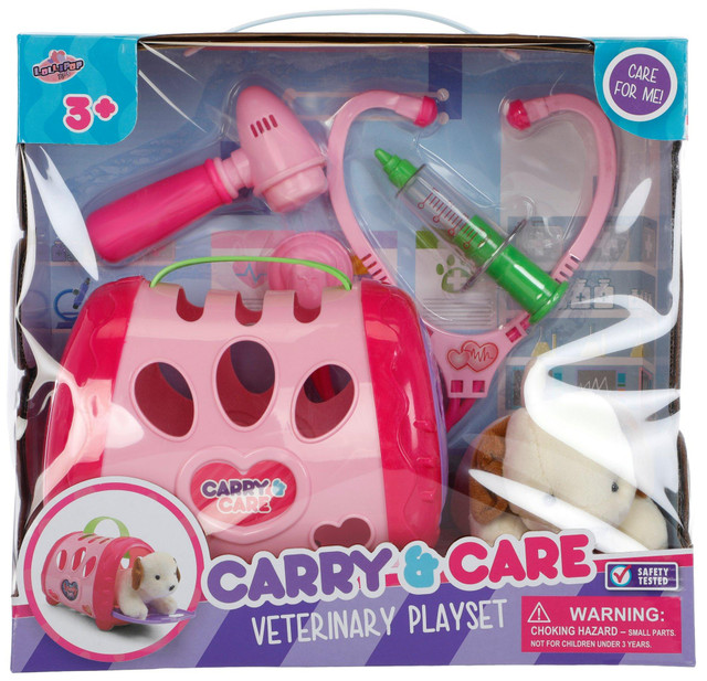 Take care of furry friends with the veterinary playset. Features a plush pup with the tools to keep them healthy! Includes carrier, sethoscope, otoscope and syringe. Ages 3+.