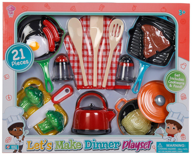 This kids playset for making dinner includes 21 pieces of cookware and food, featuring a cutting board, pasta, and steak, inspiring imaginative cooking and mealtime play.