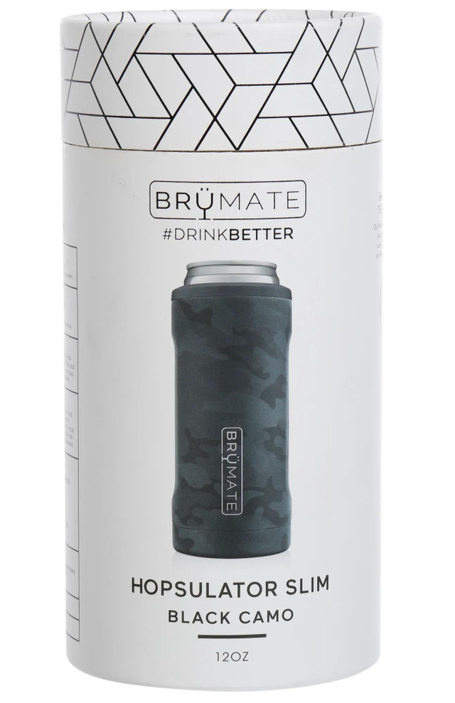 Keep beverages ice cold with the 12 oz Hopsulator Slim Can Cooler in Black Camo. Engineered to fit slim cans such as Red Bull or White Claw, it prevents condensation and maintains temperature up to 20 times better than standard can coolers. Ideal for outdoor events or everyday use. Fabrication is stainless steel. Holds 12 oz slim cans.