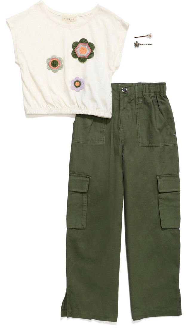 This 2-piece set for big girls includes army green cargo pants and a cream crop top with three embroidered flowers. The top features a round neck and cinched waist for a stylish fit. Two barrettes, one green and one white flower, complete the look. Perfect for casual days with a touch of charm and utility.