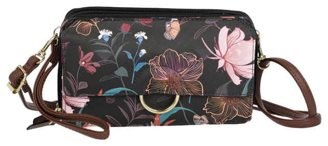 This Floral Zip Around Organizer Wristlet Crossbody features a durable vegan leather fabrication, a front flap snap pocket with ring detail, an adjustable removable crossbody strap, a removable wristlet strap, and dual zip-around closures. The lined interior includes eighteen card slots, one window id slot, one zip compartment, five slip pockets, and one currency compartment. Measures approximately 8 in. L x 2 in. W x 5 in. H. Strap drop measures approximately 24 in.