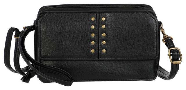 Introducing the Studded Crossbody Bag, a perfect blend of vintage style and modern convenience. This faux leather bag features stud accents and bronze-tone hardware for a chic look. It comes with an adjustable crossbody strap for comfortable wear. The front flap pocket and top double zip compartment with a lined interior, including inner slip and zip pockets, provide ample storage for your essentials. Measuring approximately 8 in x 4.5 in, it's an ideal accessory for any occasion.