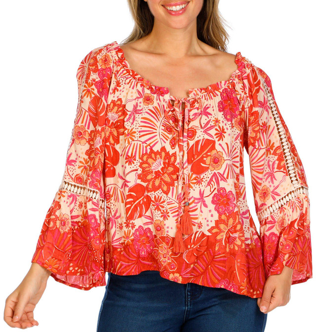 Float through your day in effortless elegance with this long sleeve top, featuring romantic bell sleeves and intricate open crochet inset details. The tied lace neck adds a touch of vintage charm, while the elastic neckline offers versatile styling, wear it on or off the shoulder.