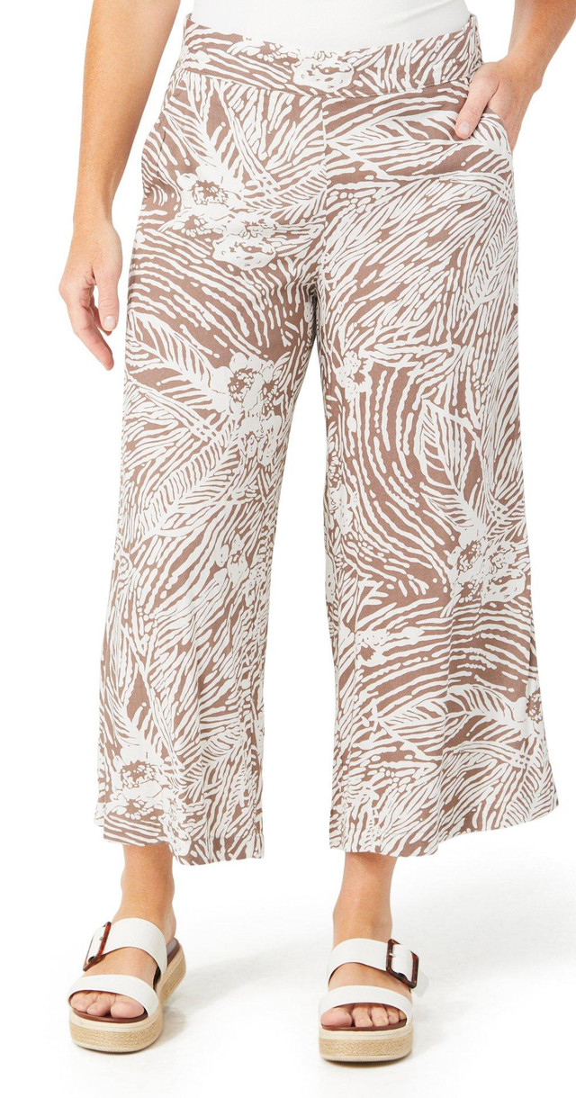 These petite wide leg pants feature a soft printed fabric with a comfortable pull on design. It includes functional pockets for added convenience. The relaxed fit and lightweight feel make it ideal for everyday wear.