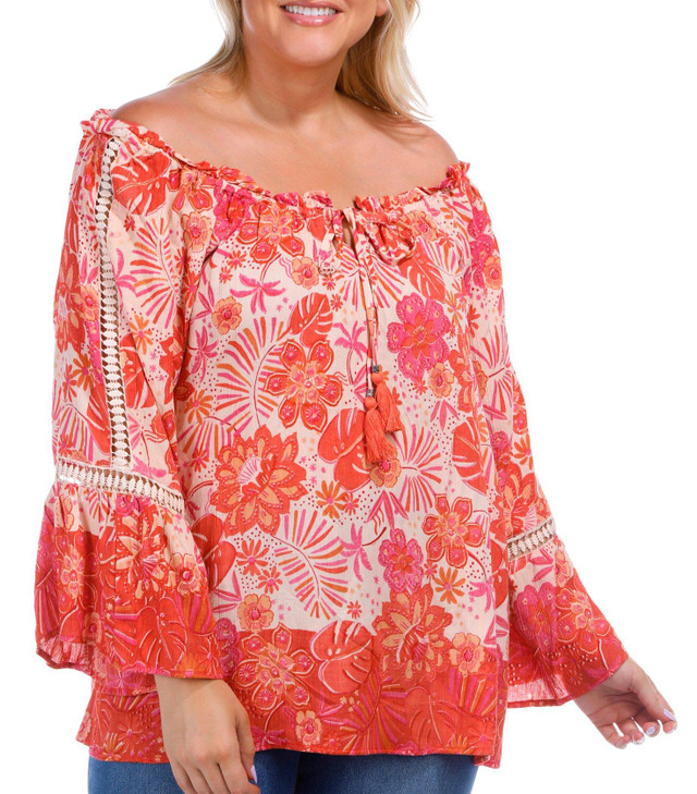 Embrace nature inspired elegance with this Plus Floral Bell Sleeve Top, made from 100% rayon for a soft and flowy fit. This chic top features a beautiful floral print, elegant bell sleeves, and a stylish keyhole neckline. Perfect for any occasion, it effortlessly combines comfort and fashion, making it a versatile addition to your wardrobe. Fabrication is 100% Rayon. Top length measures approximately 28 in.