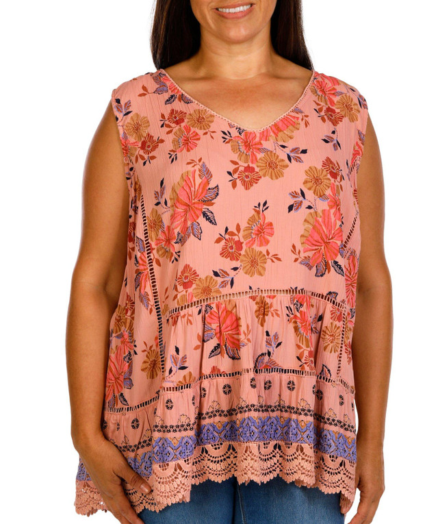 This plus size sleeveless floral top features a flattering v neckline with delicate crochet trim along the collar and hem. The vibrant floral print adds a fresh and feminine touch, making it perfect for warm weather days or layering under a light jacket. Fabrication 100% rayon