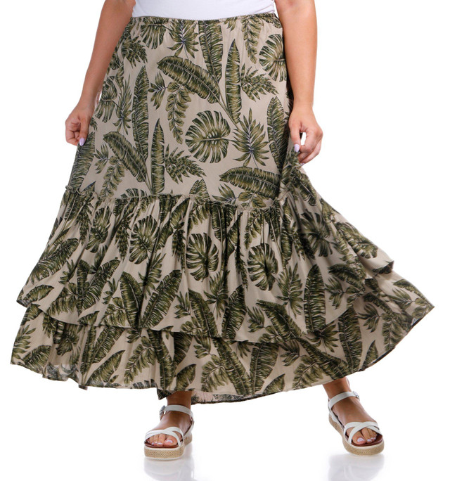 Elevate your style with our Plus 2 Tier Floral Maxi Skirt! Crafted from 100% rayon, this skirt offers a lightweight and breathable feel, perfect for any season. It features a stretch waistband for a customizable fit and a tiered hem that adds a touch of elegance. It provides a graceful silhouette that's ideal for both casual and dressy occasions. Fabrication is 100% Rayon. Skirt length measures approximately 40 in.