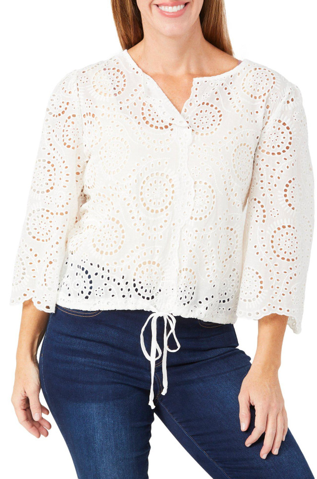 Add a touch of texture with the Women's 3/4 Sleeve Eyelet Tie Top. Featuring a solid color and all-over eyelet design, its styled with a split neckline and a bottom tie for a flattering, feminine finish. Self 100% cotton. Contrast 62% rayon, 38% polyester