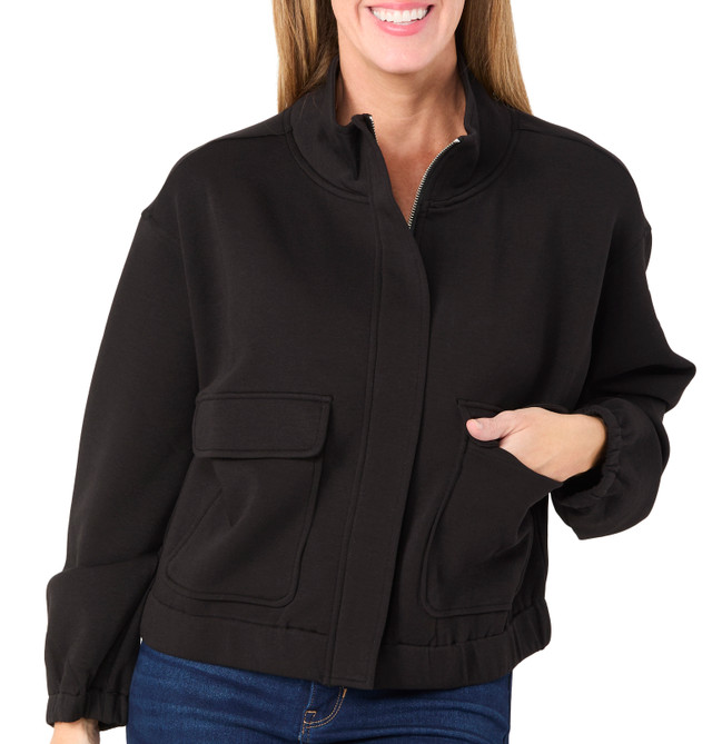 Stay effortlessly casual with the Womens Cargo Pocket Knit Full Zip Solid Jacket, designed with soft knit fabric in a solid color and a relaxed cut for easy movement. Features a high collar, full zip front, long sleeves, and front cargo pockets for added style and function. Fabrication is 50% polyester, 44% rayon, 6% spandex. Length measures approximately 21 in