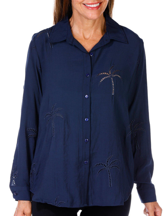 This long-sleeve womens button-down combines breezy elegance with everyday comfort. Designed with a casual collar and split neckline, its adorned with eyelet palm tree accents that evoke a relaxed, coastal vibe. Perfect for layering or wearing solo on sun-kissed days. Fabrication is 62% rayon and 38% polyester.