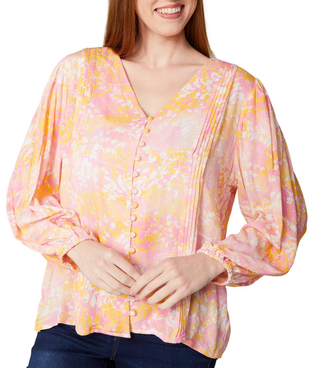 This Long Sleeve Top is a perfect blend of elegance and comfort. Featuring a buttoned front and metallic stitching, it adds a touch of sophistication to any outfit. The pleated details enhance its stylish appeal, while the elastic cuffs provide a comfortable fit. Ideal for both casual and dressy occasions, this top is a versatile addition to your wardrobe. Fabrication is 99% rayon and 1% lurex.