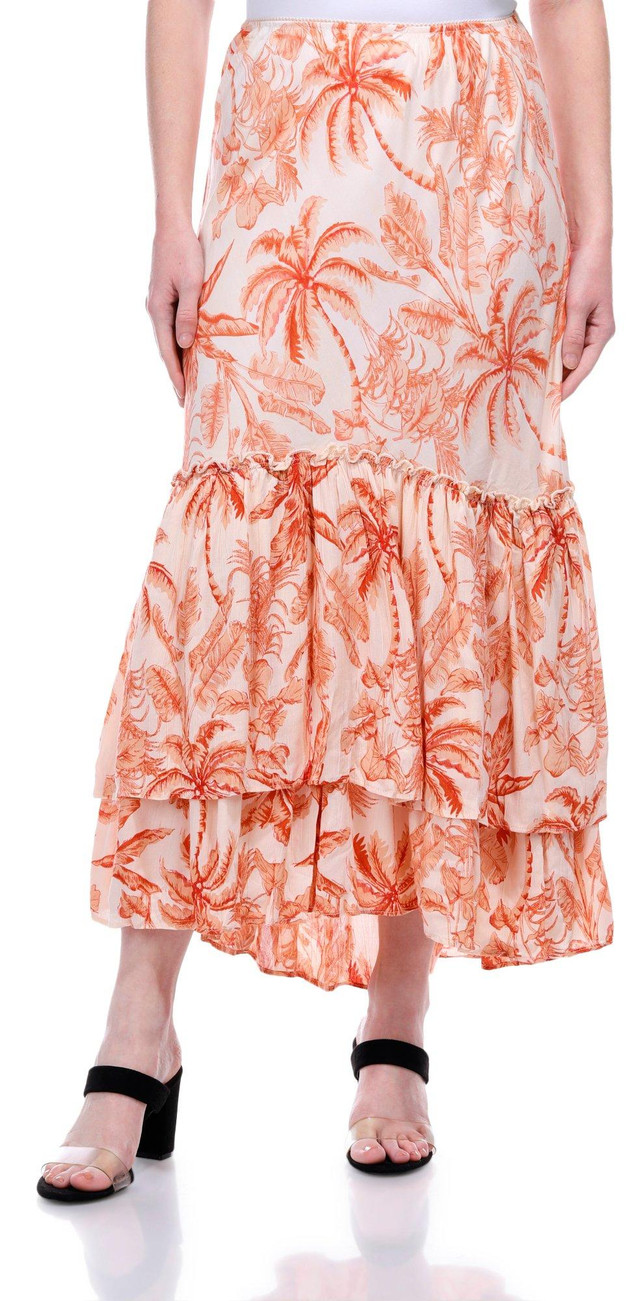 Introducing our Women's Palm Print Ruffle Tier Skirt, crafted from 100% rayon for a lightweight and comfortable fit. This stylish skirt features a vibrant palm print, an elastic waistband for easy wear, and a charming ruffle tier hem. With a 34-inch length, it offers a flowing and elegant look that's perfect for any occasion. Elevate your wardrobe with this versatile and fashionable ruffle tier skirt!