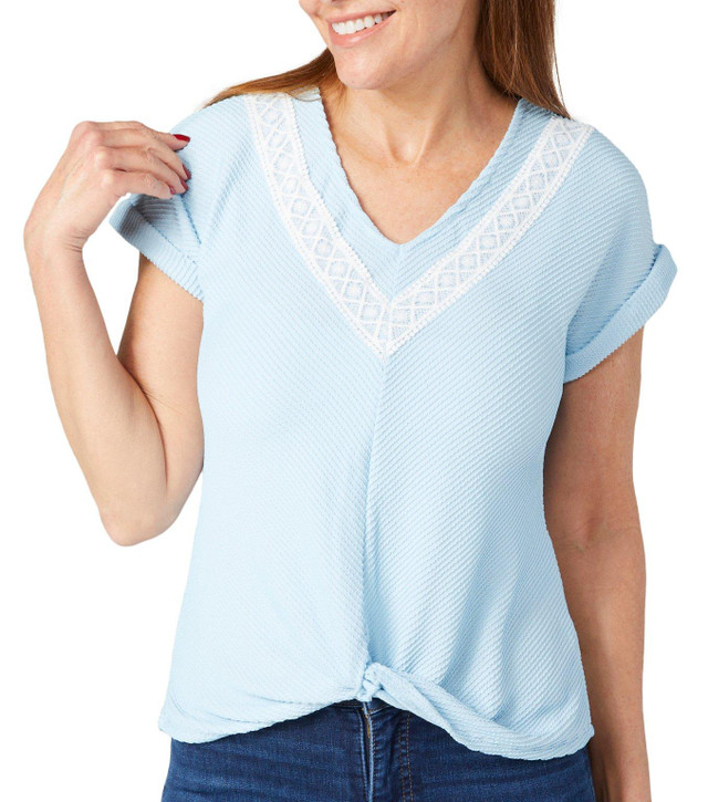 Add a touch of elegance to your wardrobe with this Short Sleeve Top. Featuring delicate crochet trim and crafted from soft, ribbed fabric, this top offers both style and comfort. The front twist detail adds a unique and flattering touch, making it perfect for casual outings or special occasions. Fabrication is 93% polyester, 7% spandex.