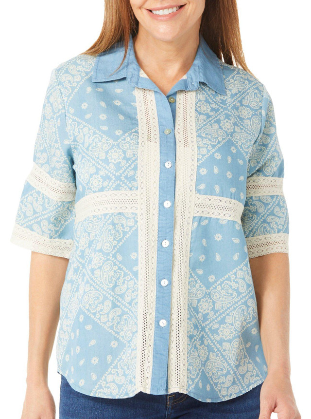 Bring a touch of vintage charm to your wardrobe with this Short Sleeve Top, featuring a buttoned front and a swirling paisley print. Delicate lace trim details add a soft, feminine finish, making it the perfect blend of classic and contemporary. Light, breezy, and effortlessly stylish, this top is made to stand out. Fabrication 64% cotton, 36% polyester.
