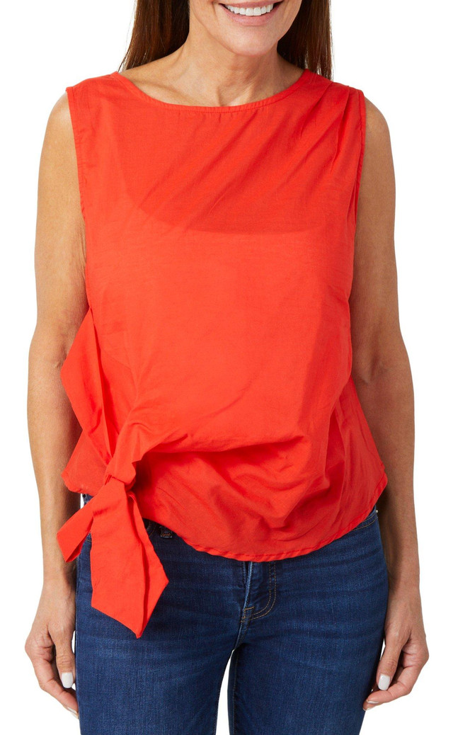 Add a touch of elegance with the Women's Sleeveless Side Bow Wrap Top, featuring a classic round neckline, sleek solid color, and a flattering wrap design with a side tie hem. Perfect for dressing up or down with effortless style.
