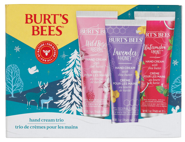 Burts Bees 3 Pc Hand Cream Trio pampers skin with rich nourishing moisture in three delightful scents. Each cream absorbs beautifully to soften and smooth dry hands while leaving a gentle comforting fragrance. A perfect gift or daily indulgence that keeps hands feeling cared for and beautifully refreshed. Free of parabens, phthalates, petrolatum, and SLS. Cruelty-free. 1 oz. each.