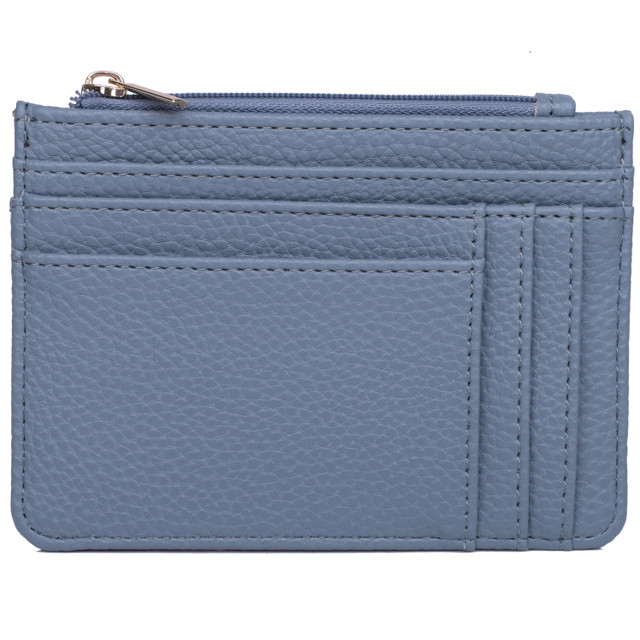 Solid Pebble Vegan Leather with RFID blocking lining Goldtone Hardware Slot Coin Pouch features a top zip compartment, 5 credit card slots, 2 utility pockets and an ID window. Measures: 5.25 x 4 x .25.