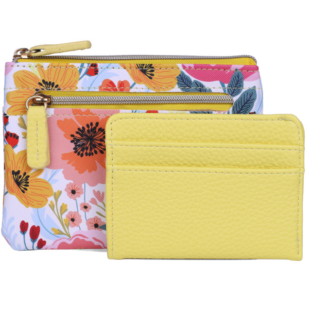 This Peony Pastures ID Coin Case features a beautiful design on sturdy vegan leather fabrication, one top exterior zip pocket, an ID slot, and credit card slots. Measures approximately 5.5 in. x 4 in.
