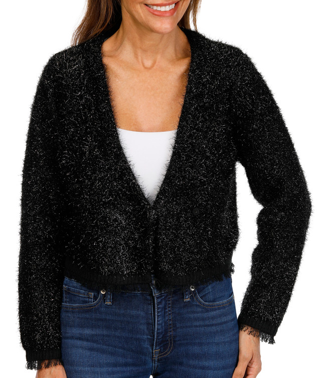 This juniors shimmering cardigan features long sleeves and an adjustable snap closure. It provides cozy warmth while adding sparkle to every outfit, perfect for comfort and style during playful days or special moments. Fabrication is 40% acrylic, 30% metal, 20% nylon, and 10% polyester.