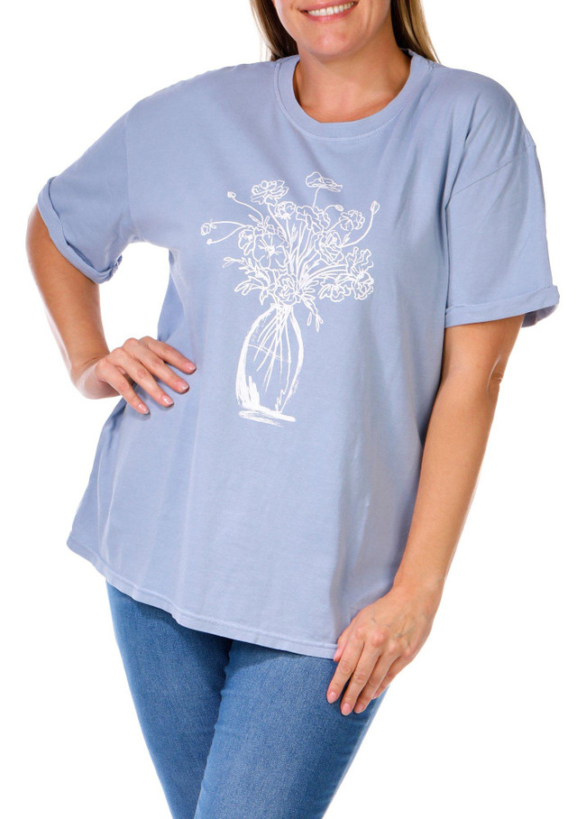 Introducing the Women's Drew Sunwashed BF Bouquet Top, made from 100% cotton for a soft and comfortable fit. This casual top features a classic crew neckline and short sleeves, perfect for everyday wear. The charming bouquet graphic design on the chest adds a whimical touch, making it a great addition to your summer wardrobe. Ideal for beach outings or relaxed weekends!