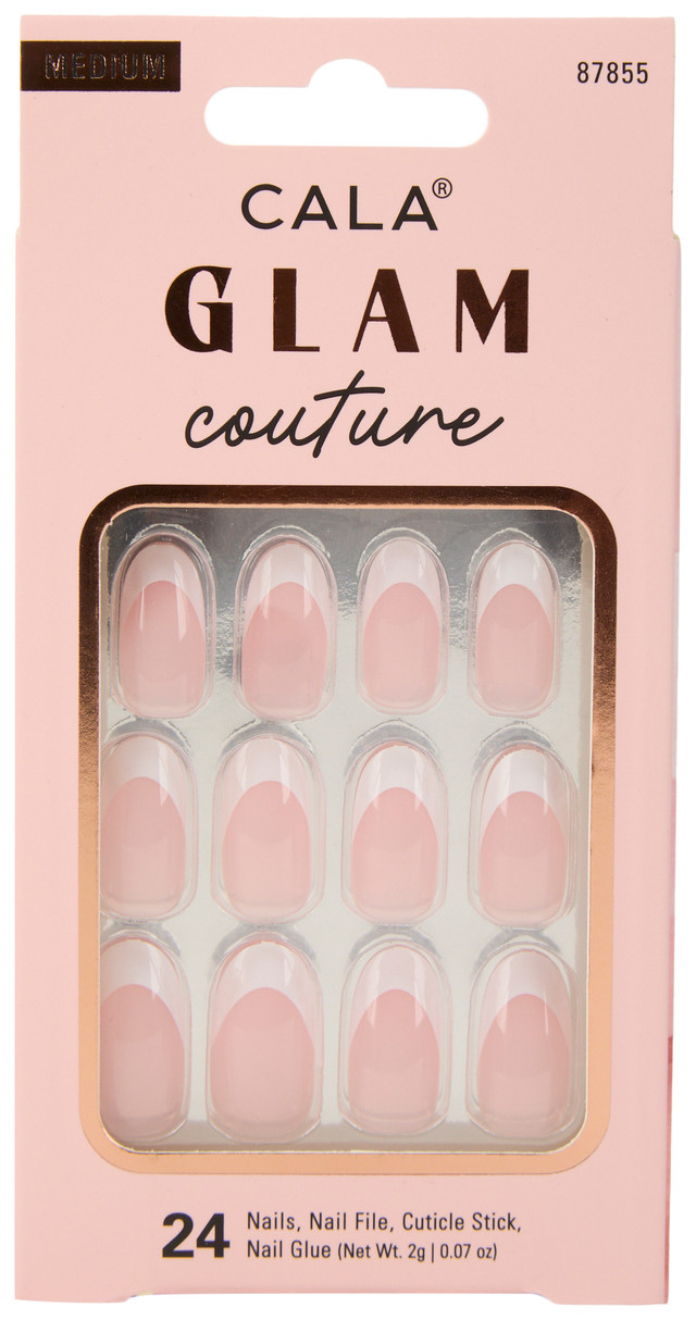 Includes a set of 24 nails, gel glue, miniature file, and manicure stick. Includes a nude French nail style & rounded shape.
