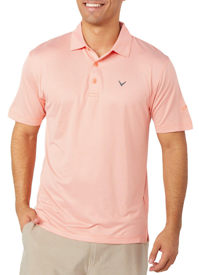 This mens short sleeve performance golf polo features a striped design for classic style. Crafted with stretchy fabric and built in sun protection, this polo keeps you comfortable on the course or off, making it an ideal choice for golf, outdoor activities, or casual wear. Fabrication is 95% polyester and 5% elastane.