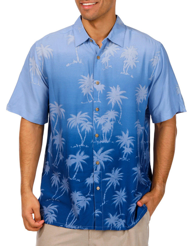 Stay cool and protected in the Men's Short Sleeve Shaded Palms Button Down Shirt. Featuring a classic collar, button-down front, and breezy palm tree print, it is the perfect blend of laid-back style and everyday comfort. Fabrication is 98% rayon, 2% spandex