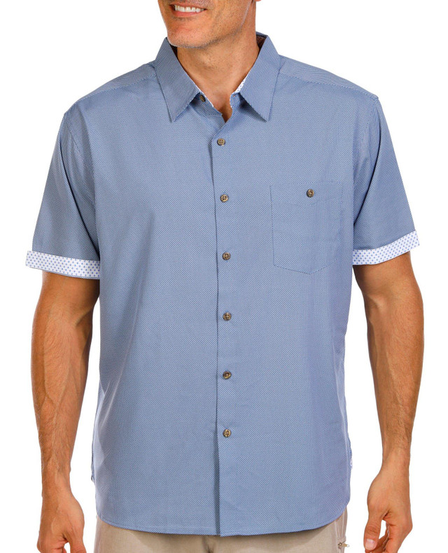 This woven short sleeve shirt features a buttoned front, chest pocket, and a sharp micro print. Designed with cooling technology, stretch fabric, and a wrinkle free finish, it delivers all day comfort with a polished look. Fabrication is 92% polyester, 8% spandex.