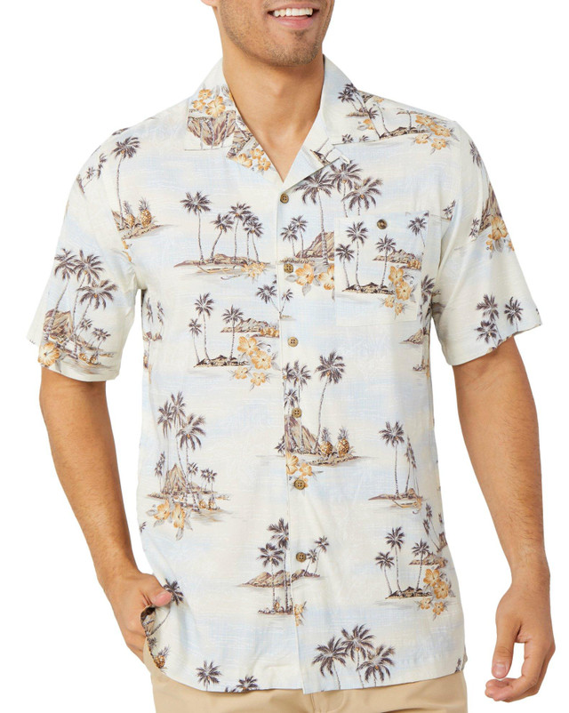 Embrace the tropical vibe with our Men's Island Palm Print Button Down Shirt. The vibrant print adds a touch of island flair, while the button-down front and collared neckline offer a classic, polished look. With short sleeves, this shirt is ideal for casual outings or beach getaways, keeping you cool and stylish all season long. Fabrication 98% rayon, 2% spandex