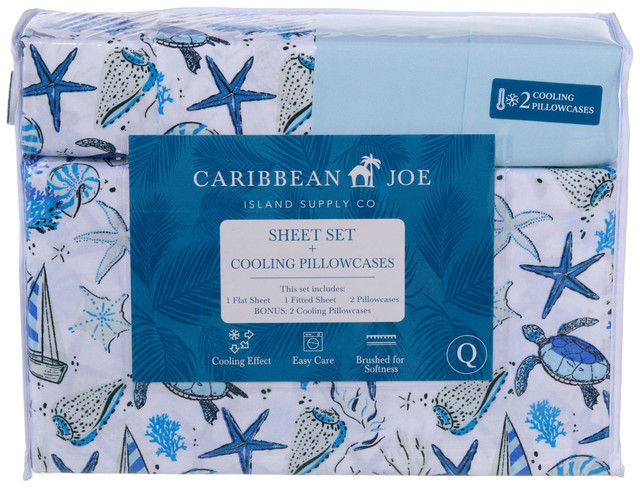 Drift into comfort with this 6-piece Cooling Marine Life Sheet Set, featuring a playful sea animal print. The set includes 1 flat sheet, 1 fitted sheet, 2 printed pillowcases, and 2 cooling pillowcases.